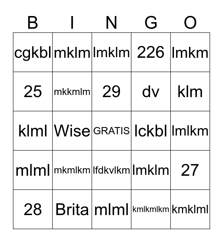 This bingo card has a free space and 30 words: Brita, Gustavo, Wise, fvlx, cgkbl, lmklm, mkkmlm, lfdkvlkm, lckbl, mlml, lmlkm, kmklml, kmlkmlkm, mlmk, klm, klmlk, lmklm, mlml, mkmlkm, lmkm, klml, k, mklm, dv, 25, 226, 27, 28, 29 and 30.