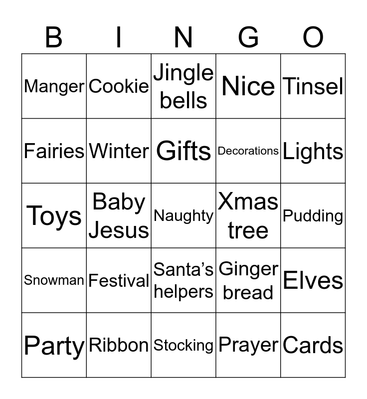 This bingo card has 45 words: Angel, Baby Jesus, Candles, Candy cane, Cards, Carols, Cookie, Decorations, Decorations, Elves, Fairies, Festival, Gifts, Ginger bread, Greetings, Holly leaves, Hot chocolate, Jingle bells, Kings, Lights, Manger, Merry, Naughty, Nice, North Pole, Party, Plum cake, Popcorn, Prayer, Pudding, Reindeer, Ribbon, Santa’s helpers, Sleigh, Snow flakes, Snowman, Stars, Stocking, Sugarplum, Tinsel, Toys, Winter, Wishes, Xmas tree and Yule log.