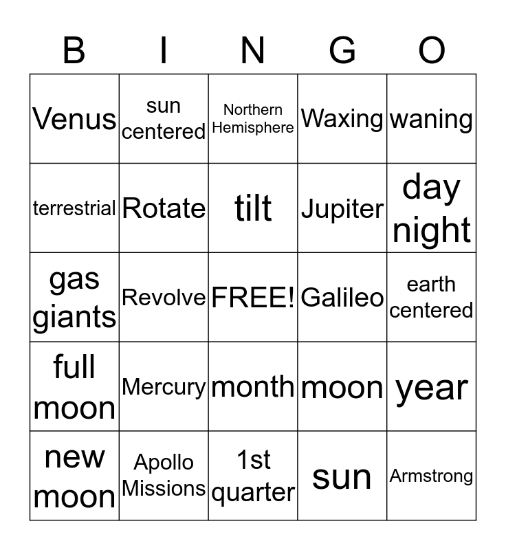 This bingo card has a free space and 24 words: Mercury, Apollo Missions, tilt, new moon, waning, Venus, terrestrial, sun centered, Galileo, month, Jupiter, gas giants, moon, year, Rotate, sun, earth centered, Northern Hemisphere, day night, Revolve, Armstrong, full moon, Waxing and 1st quarter.