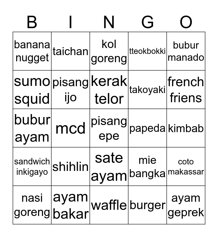 This bingo card has a free space and 24 words: shihlin, ayam bakar, kerak telor, nasi goreng, bubur manado, banana nugget, sumo squid, taichan, papeda, sate ayam, takoyaki, bubur ayam, mie bangka, coto makassar, pisang ijo, burger, kimbab, kol goreng, french friens, mcd, ayam geprek, sandwich inkigayo, tteokbokki and waffle.