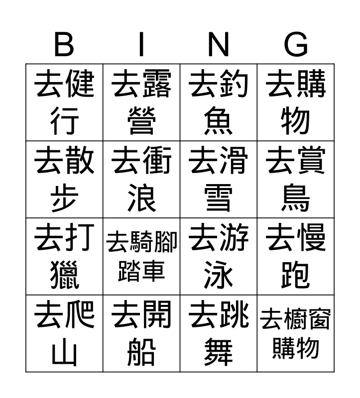 This bingo card has 16 words: 去開船, 去慢跑, 去釣魚, 去健行, 去打獵, 去露營, 去游泳, 去跳舞, 去散步, 去衝浪, 去爬山, 去購物, 去騎腳踏車, 去賞鳥, 去滑雪 and 去櫥窗購物.