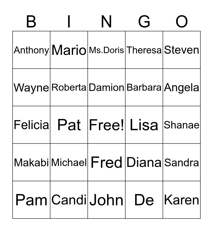 This bingo card has a free space and 24 words: Michael, Candi, Damion, Pam, Steven, Anthony, Wayne, Mario, Lisa, Fred, Barbara, Felicia, Diana, Sandra, Roberta, De, Shanae, Ms.Doris, Angela, Pat, Karen, Makabi, Theresa and John.