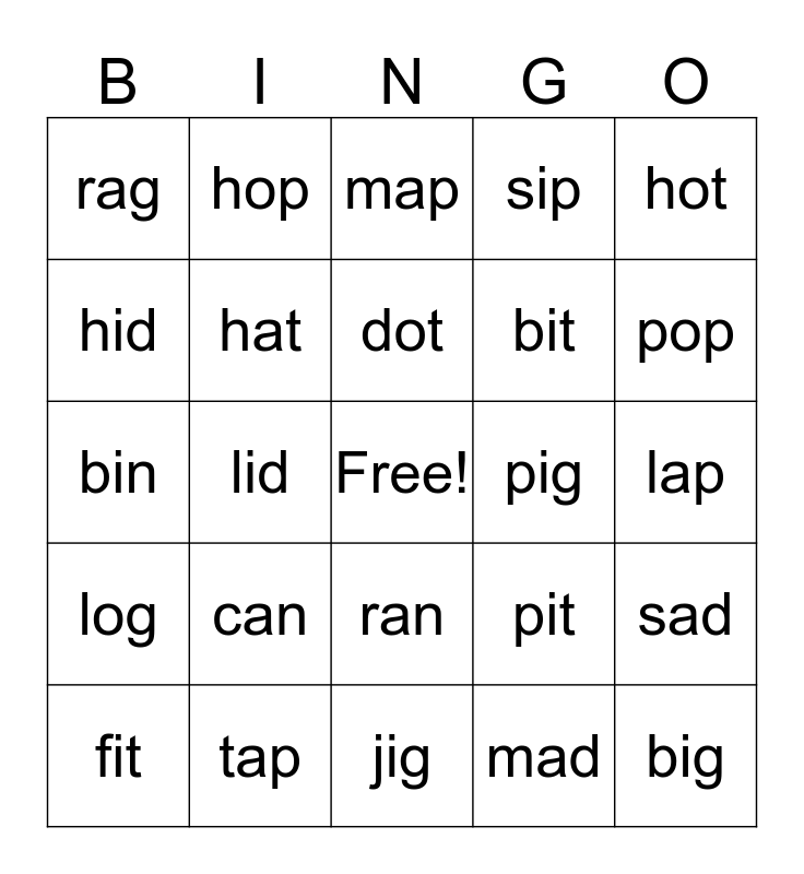 This bingo card has a free space and 24 words: fit, can, dot, mad, hot, rag, hop, map, pig, lap, bin, hat, pit, sad, hid, tap, jig, sip, pop, log, lid, ran, bit and big.