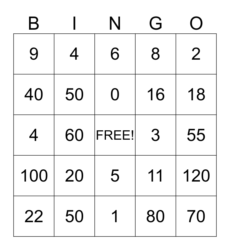 This bingo card has a free space and 24 words: 20, 50, 0, 22, 2, 9, 40, 4, 3, 5, 16, 4, 11, 120, 50, 80, 55, 6, 18, 60, 70, 100, 8 and 1.