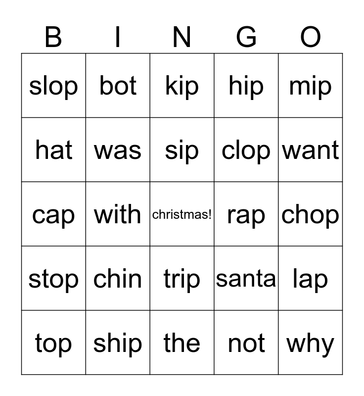 This bingo card has a free space and 24 words: chin, ship, sip, top, mip, slop, hat, bot, rap, trip, clop, cap, santa, lap, was, not, chop, kip, want, with, why, stop, hip and the.