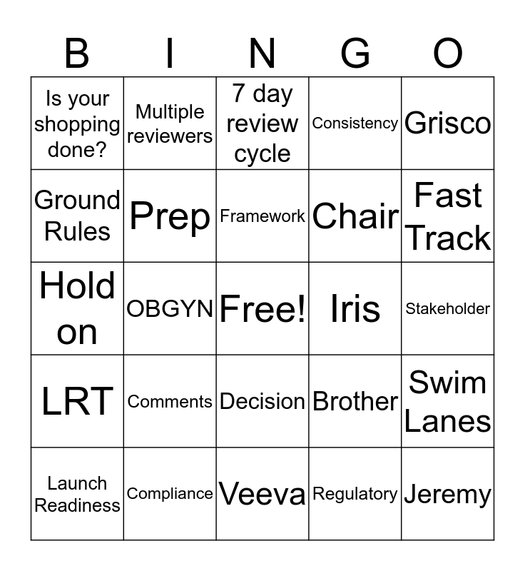 This bingo card has a free space and 164 words: Mark Kuskin, There was no traffic today, Fighting a cold, Mother-in-law, Reviewer, Veeva, Owner, Excuse me, House full, Good Morning, Is your shopping done?, Keenan, Chair, Lunch Time, Hold on, Let's take a break, Prioritize, Greg, Can you clarify, Who wants to play jenga?, Need anything from the kitchen?, Kelly, Merry Christmas, Approved, Resubmit, Expediated, PMRC, Holly, Let's wrap this up, Today's agenda, Out of town, Snacks, Iris, John, Is that snow?, Holly, I am hosting, Stress ball, Sick, Sorry I was late, One last question, Danielle, Mark, Alicia, Sage, Father-in-law, Kids, Santa, Elf on a Shelf, Anyone have an extra pen?, Whose scribbing?, New Years, Whose up next?, Gum, Santa, Legal, Medical, Regulatory, Wine, Done Shopping, Mall, Sister, Brother, Parents, REMs, OBGYN, CNS, Patients, Doctor Office, LRT, Sales Training Meeting, Veeva, Hospital, Site of Care, PPD, FDA, Specialty Pharmacy, Brown Bagging, Training Materials, Launch Readiness, Material Review, Framework, Mutual Agreement, Schedule, Governance, Leadership, Comm Ops, Scientific Platform, Swim Lanes, Ground Rules, Alignment, Empower, Sponsors, Advocate, Culture, Deliverables, 7 day review cycle, Pharma, Let's listen, No interruption, Industry Norms, Decision, Edits, Case Manager, Market Access, Patient Support Services, Human Resources, Clinical Trials, Fast Track, HCO, Physician Assistant (PA), Plan of Action (POA), IV, Hospitals, Clinics, Cost, Boston, NDA, Patriots, SOP, Compliance, Payer Marketing, Sanders, Jeremy, Team Goals, Cross-functional, Birthday, Consistency, Transitions, Scientific Platform, Comments, Deadlines, Governance, Grisco, Salisbury, Yr end, Self-Assessment, Feedback, One Sage, Transformative, Celebrate, Success, Pivot, Mental Health, Closing the loop, Prep, Manager, Confidential, Stakeholder, End Early, Pre-read, "D", I can't hear you, Tomorrow, Today, Multiple reviewers, Edits, Pre-mtgs, Friends, Coworkers, Money, Weekend, Recommend and Effecient.