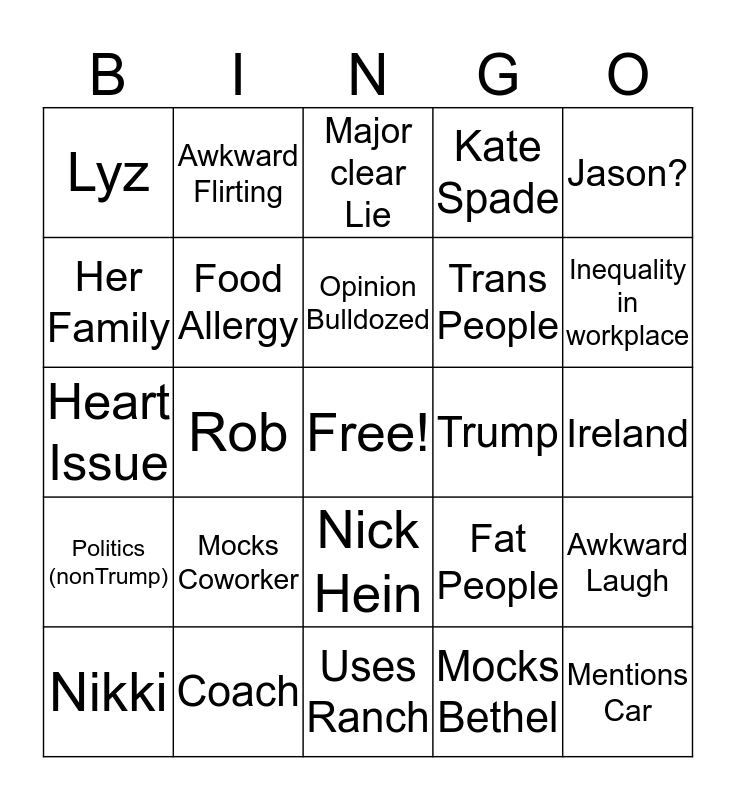 This bingo card has a free space and 29 words: Nikki, New Medical Issue, Rob, Douglas, Lyz, Major clear Lie, Food Allergy, Mocks Coworker, Trump, Coach, Ireland, Mentions Car, Uses Ranch, Mocks Bethel, Inequality in workplace, Carter / Miranda, Nick Hein, Politics (nonTrump), Jason?, Heart Issue, Fat People, Clearly Racist Comment, Trans People, Her Family, Kate Spade, Awkward Flirting, Awkward Laugh, Opinion Bulldozed and Leah-ing.