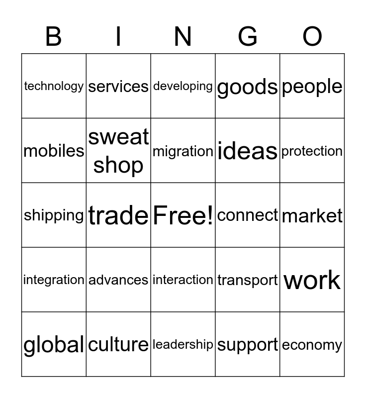 This bingo card has a free space and 29 words: global, multi national, trade, internet, technology, developing, sweat shop, advances, connect, culture, market, economy, leadership, support, protection, trend, interaction, integration, people, shipping, transport, banking, ideas, mobiles, goods, services, work, migration and degrading.