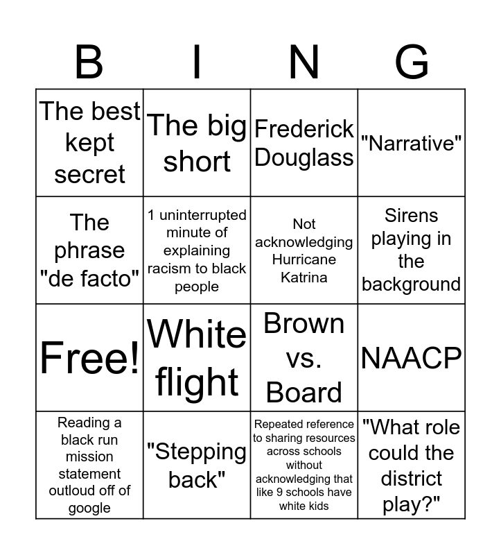 This bingo card has 20 words: NAACP, Redlining, Frederick Douglass, Michelle Alexander, Reading a black run mission statement outloud off of google, The phrase "de facto", "Stepping back", The best kept secret, Free!, The big short, White flight, Brown vs. Board, 1 uninterrupted minute of explaining racism to black people, "What role could the district play?", Not acknowledging Hurricane Katrina, MLK, Sirens playing in the background, "Narrative", Repeated reference to sharing resources across schools without acknowledging that like 9 schools have white kids and Mispronouncing any Louisiana-specific word (bonus if it's Plaquemines).