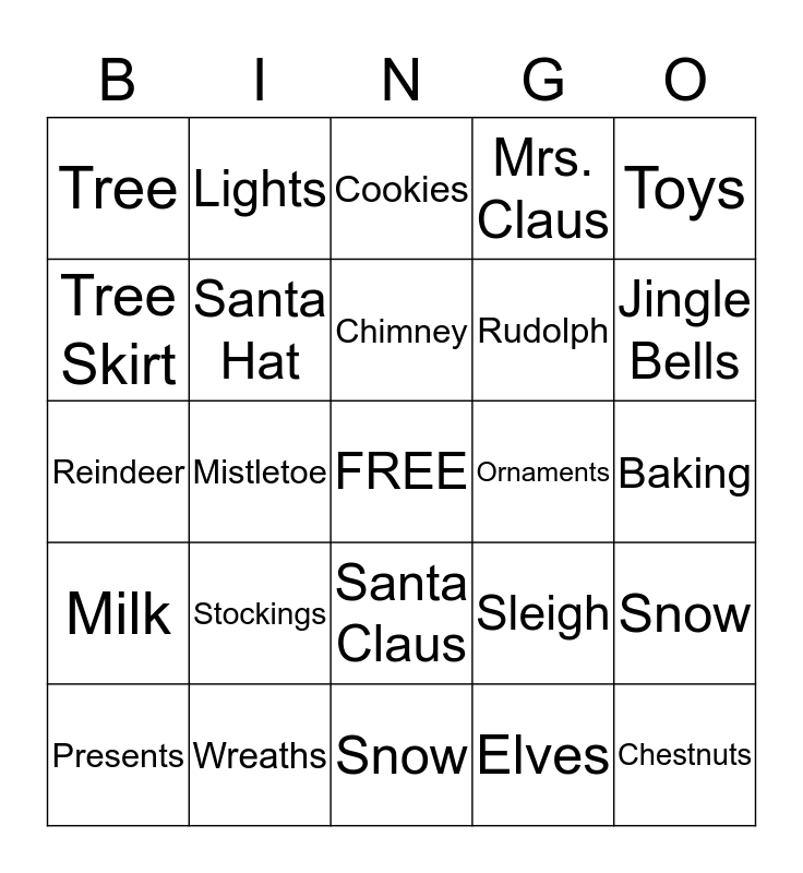 This bingo card has a free space and 24 words: Stockings, Wreaths, Chimney, Presents, Toys, Tree, Tree Skirt, Lights, Ornaments, Santa Claus, Rudolph, Reindeer, Sleigh, Snow, Santa Hat, Elves, Baking, Cookies, Jingle Bells, Mistletoe, Chestnuts, Milk, Mrs. Claus and Snow.