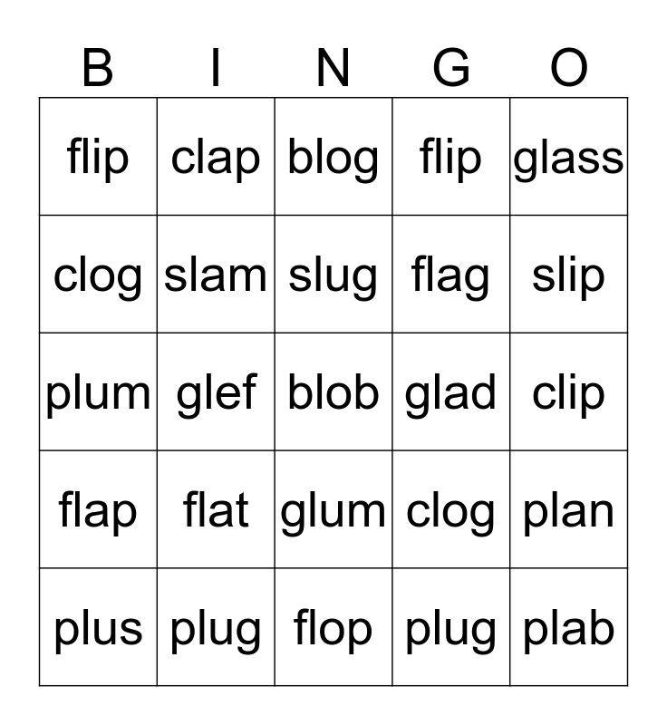 This bingo card has a free space and 24 words: flat, plug, slug, plus, glass, flip, clog, clap, glad, glum, flag, plum, clog, plan, slam, plug, clip, blog, slip, glef, plab, flap, flip and flop.
