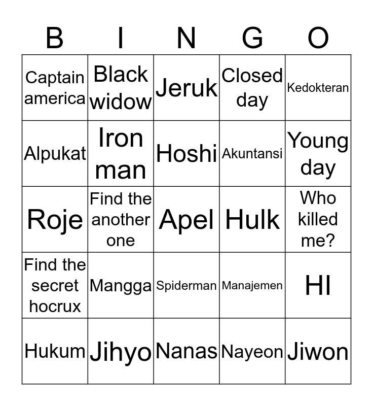 This bingo card has a free space and 24 words: Mangga, Jihyo, Hoshi, Hukum, Kedokteran, Captain america, Alpukat, Black widow, Hulk, Spiderman, Akuntansi, Roje, Manajemen, HI, Iron man, Nayeon, Who killed me?, Jeruk, Young day, Find the another one, Jiwon, Find the secret hocrux, Closed day and Nanas.