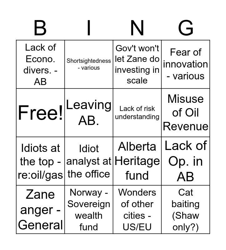 This bingo card has 16 words: Norway - Sovereign wealth fund, Lack of Op. in AB, Gov't won't let Zane do investing in scale, Lack of Econo. divers. - AB, Idiots at the top - re:oil/gas, Shortsightedness - various, Alberta Heritage fund, Wonders of other cities - US/EU, Free!, Leaving AB., Zane anger - General, Fear of innovation - various, Idiot analyst at the office, Misuse of Oil Revenue, Lack of risk understanding and Cat baiting (Shaw only?).