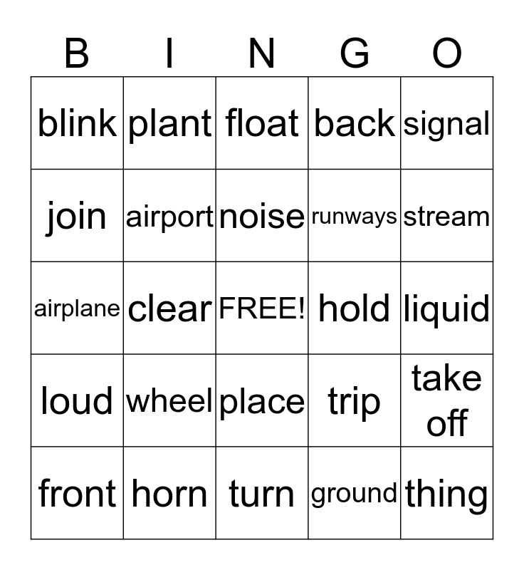 This bingo card has a free space and 24 words: wheel, horn, noise, front, signal, blink, join, plant, hold, place, runways, airplane, trip, take off, airport, ground, liquid, float, stream, clear, thing, loud, back and turn.