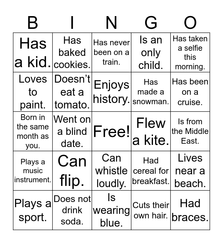 This bingo card has a free space and 25 words: Can flip., Is wearing blue., Enjoys history., Plays a sport., Has taken a selfie this morning., Has a kid., Loves to paint., Has baked cookies., Flew a kite., Can whistle loudly., Has made a snowman., Born in the same month as you., Had cereal for breakfast., Lives near a beach., Doesn’t eat a tomato., Has been to Spain., Is from the Middle East., Has never been on a train., Has been on a cruise., Went on a blind date., Had braces., Does not drink soda., Plays a music instrument., Is an only child. and Cuts their own hair..