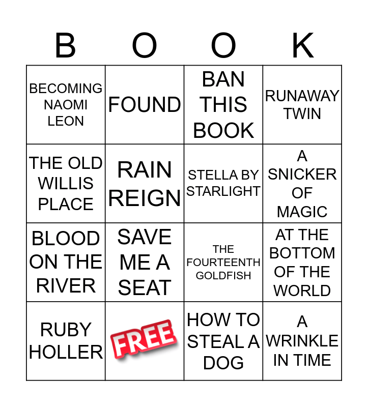 This bingo card has 1 images and 15 words: AT THE BOTTOM OF THE WORLD, BAN THIS BOOK, BECOMING NAOMI LEON, BLOOD ON THE RIVER, FOUND, THE FOURTEENTH GOLDFISH, HOW TO STEAL A DOG, THE OLD WILLIS PLACE, RAIN REIGN, RUBY HOLLER, RUNAWAY TWIN, SAVE ME A SEAT, A SNICKER OF MAGIC, STELLA BY STARLIGHT and A WRINKLE IN TIME.