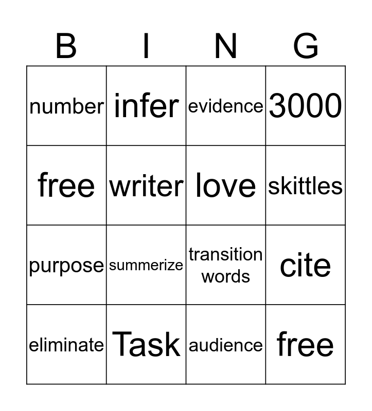 This bingo card has 16 words: Task, cite, evidence, number, purpose, infer, transition words, audience, free, writer, eliminate, 3000, summerize, skittles, love and free.