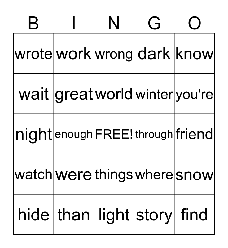 This bingo card has a free space and 24 words: were, than, world, hide, know, wrote, wait, work, through, things, winter, night, where, snow, great, story, friend, wrong, you're, enough, find, watch, dark and light.