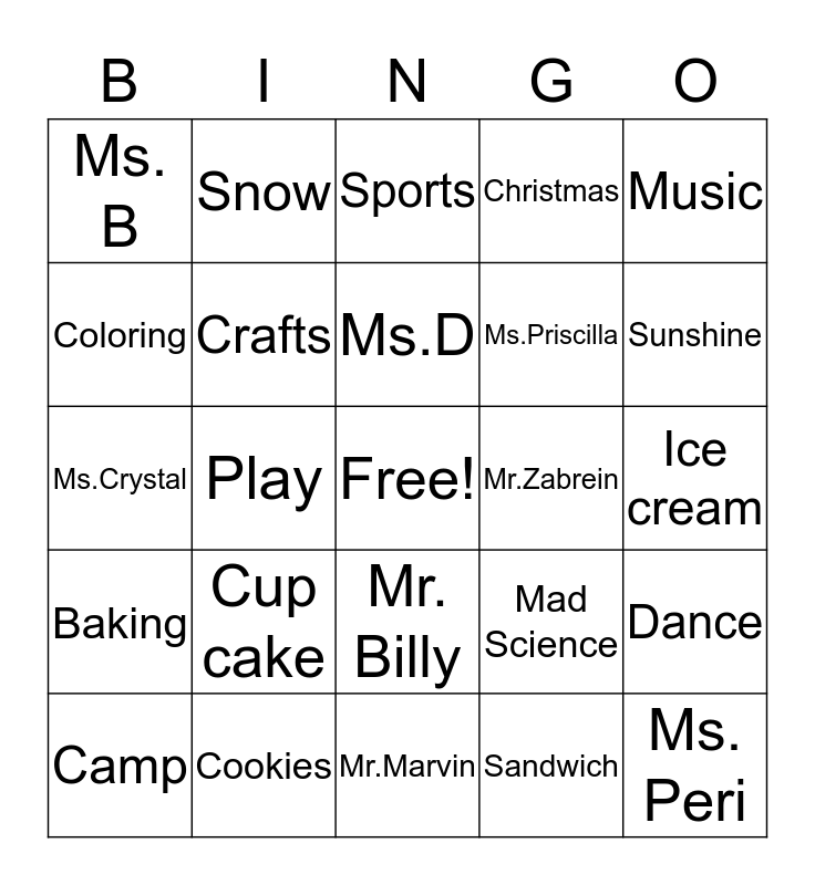 This bingo card has a free space and 29 words: Camp, Laugh, Play, Games, Ms. B, Sports, Crafts, Cup cake, Mr.Zabrein, Cookies, Ice cream, Ms. Peri, Mr.Marvin, Sandwich, Sunshine, Soda, Mr. Billy, Baking, Music, Ms.Crystal, Mad Science, Painting, Ms.Priscilla, Coloring, Christmas, Snow, Dance, Ms.D and Team.