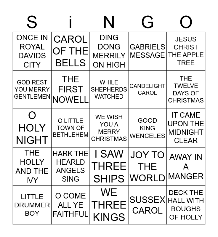 This bingo card has 25 words: HARK THE HEARLD ANGELS SING, WE THREE KINGS, WHILE SHEPHERDS WATCHED, LITTLE DRUMMER BOY, JESUS CHRIST THE APPLE TREE, ONCE IN ROYAL DAVIDS CITY, GOD REST YOU MERRY GENTLEMEN, CAROL OF THE BELLS, GOOD KING WENCELES, I SAW THREE SHIPS, CANDELIGHT CAROL, O HOLY NIGHT, JOY TO THE WORLD, AWAY IN A MANGER, THE FIRST NOWELL, DECK THE HALL WITH BOUGHS OF HOLLY, IT CAME UPON THE MIDNIGHT CLEAR, DING DONG MERRILY ON HIGH, THE TWELVE DAYS OF CHRISTMAS, O LITTLE TOWN OF BETHLEHEM, WE WISH YOU A MERRY CHRISTMAS, O COME ALL YE FAITHFUL, THE HOLLY AND THE IVY, GABRIELS MESSAGE and SUSSEX CAROL.