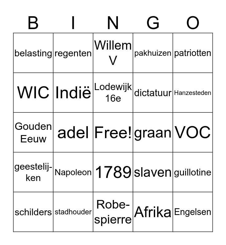 This bingo card has a free space and 34 words: Terreur, stapelmarkt, kruidnagel, grondwet, VOC, WIC, Indië, Robe-spierre, dictatuur, Engelsen, Gouden Eeuw, regenten, Afrika, 16e eeuw, geestelij-ken, adel, 1789, graan, guillotine, schilders, stadhouder, welvaart, pakhuizen, Hanzesteden, Oostzee, Napoleon, Willem V, Suriname, patriotten, belasting, revolutie, Lodewijk 16e, slaven and Lincoln.