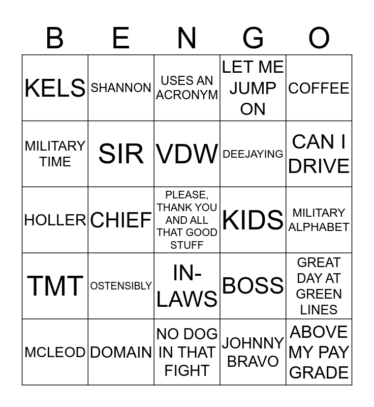 This bingo card has 25 words: OSTENSIBLY, NO DOG IN THAT FIGHT, VDW, MCLEOD, COFFEE, KELS, MILITARY TIME, SHANNON, KIDS, IN-LAWS, DEEJAYING, HOLLER, BOSS, GREAT DAY AT GREEN LINES, SIR, ABOVE MY PAY GRADE, MILITARY ALPHABET, USES AN ACRONYM, CAN I DRIVE, CHIEF, PLEASE, THANK YOU AND ALL THAT GOOD STUFF, DOMAIN, TMT, LET ME JUMP ON and JOHNNY BRAVO.