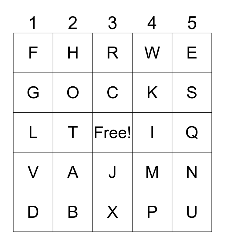 This bingo card has a free space and 24 words: A, B, C, D, E, F, G, H, I, J, K, L, M, N, O, P, Q, R, S, T, U, V, W and X.