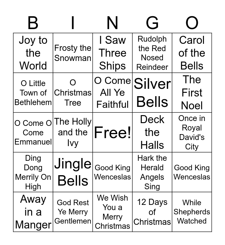 This bingo card has a free space and 29 words: Away in a Manger, Silent Night, The Holly and the Ivy, O Holy Night, Joy to the World, I Saw Three Ships, O Christmas Tree, Jingle Bells, Deck the Halls, God Rest Ye Merry Gentlemen, Once in Royal David's City, While Shepherds Watched, We Wish You a Merry Christmas, 12 Days of Christmas, The First Noel, We Three Kings, Good King Wenceslas, Ding Dong Merrily On High, Carol of the Bells, O Come O Come Emmanuel, Hark the Herald Angels Sing, White Christmas, Silver Bells, O Little Town of Bethlehem, Rudolph the Red Nosed Reindeer, Frosty the Snowman, Good King Wenceslas, O Come All Ye Faithful and Blue Christmas.