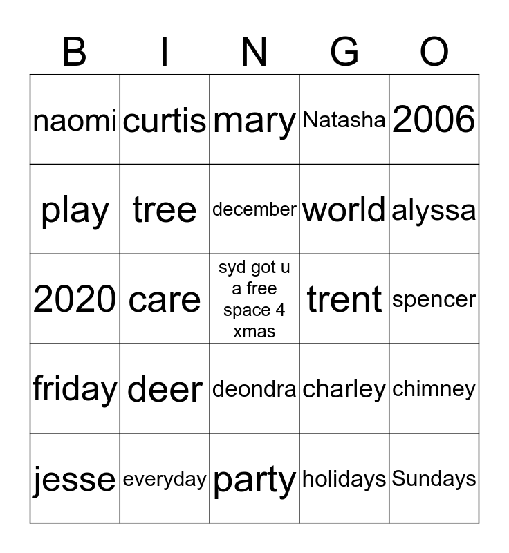 This bingo card has a free space and 89 words: dear, candy, party, give, like, Santa, hope, family, love, nezzie, xmas, christmas, Natasha, chimney, care, deer, Sydney, holidays, shiny, friends, snow, globe, world, car, 2020, 2018, 2019, 2002, 2003, movies, tree, december, comet, 2006, dance, curtis, mary, dot, spencer, dad, mom, jerey, jasmine, gold, jesse, jailyn, mona, charley, jr, naomi, fiona, jordan, nate, ethan, ham, turkey, cake, trent, brianna, tony, chelly, dion, erica, food, together, most, adore, gathering, Sundays, friday, everyday, deondra, Justin, alyssa, play, bingo, uno, familia, hope, share, care, happy, new, gifts, night, nicholas, saint, good and morning.