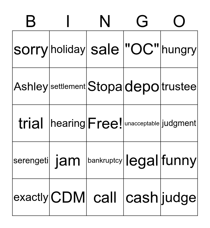 This bingo card has a free space and 24 words: jam, CDM, Stopa, exactly, hungry, sorry, Ashley, holiday, unacceptable, bankruptcy, depo, trial, legal, funny, settlement, cash, judgment, sale, trustee, hearing, judge, serengeti, "OC" and call.