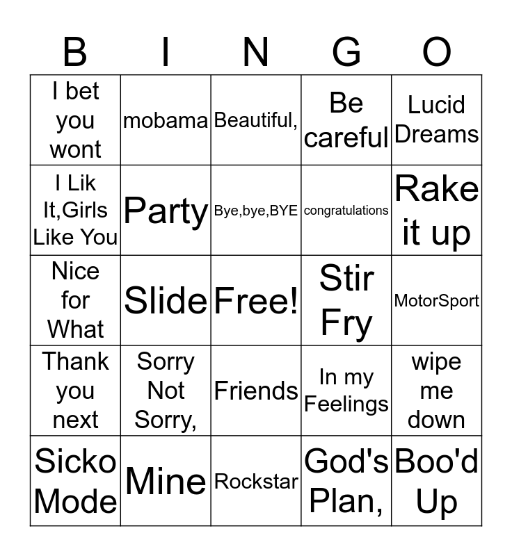 This bingo card has a free space and 29 words: Sicko Mode, Rolex, Slide, Bodak Yellow, I bet you wont, Beautiful,, Party, Sorry Not Sorry,, Stir Fry, Mine, MotorSport, Boo'd Up, Rockstar, God's Plan,, Rake it up, 1+1, Friends, Thank you next, Lucid Dreams, Nice for What, In my Feelings, bad and boujee, congratulations, I Lik It,Girls Like You, Be careful, mobama, wipe me down, Bye,bye,BYE and lucky.