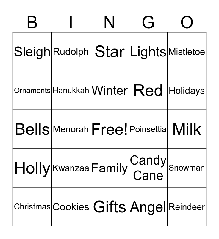 This bingo card has a free space and 29 words: Christmas, Santa, Menorah, Tree, Sleigh, Star, Hanukkah, Kwanzaa, Poinsettia, Cookies, Milk, Reindeer, Gifts, Angel, Holidays, Elf, Family, Holly, Mistletoe, Bells, Candy Cane, Green, Red, Ornaments, Lights, Rudolph, Snowman, Winter and Wreath.
