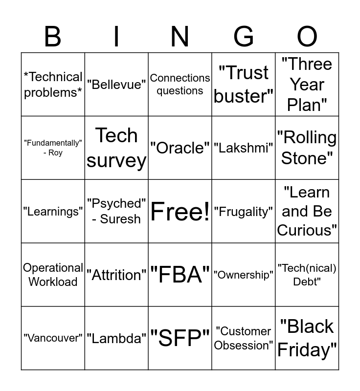 This bingo card has a free space and 31 words: "SFP", "Day 1", "Psyched" - Suresh, *Redacted Info*, *Technical problems*, Connections questions, Tech survey, "Ownership", "Frugality", "Customer Obsession", "Learn and Be Curious", "Black Friday", "IMR", "Prime Day", "Rolling Stone", Project Estimation, "Tech(nical) Debt", "Attrition", Operational Workload, "FBA", "Three Year Plan", "Away Team", "Vancouver", "Bellevue", "Lakshmi", "Fundamentally" - Roy, "Trust buster", "Learnings", "Lambda", "Oracle" and "Easyship".