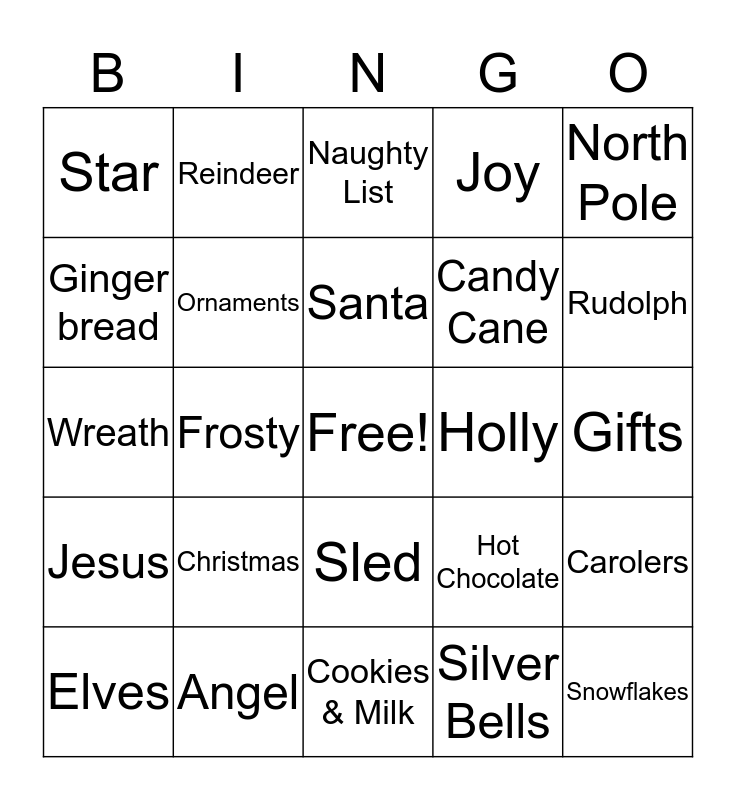 This bingo card has a free space and 24 words: Christmas, Angel, Santa, Elves, North Pole, Star, Ginger bread, Reindeer, Holly, Sled, Candy Cane, Wreath, Hot Chocolate, Carolers, Ornaments, Silver Bells, Gifts, Naughty List, Rudolph, Frosty, Snowflakes, Jesus, Joy and Cookies & Milk.