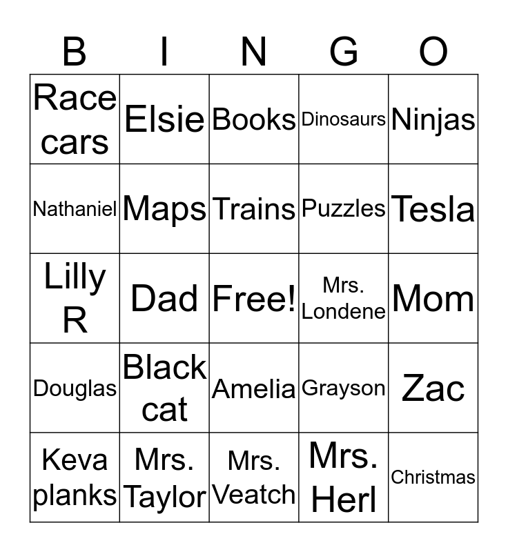 This bingo card has a free space and 24 words: Black cat, Mrs. Taylor, Trains, Keva planks, Ninjas, Race cars, Nathaniel, Elsie, Mrs. Londene, Amelia, Puzzles, Lilly R, Grayson, Zac, Maps, Mrs. Herl, Mom, Books, Tesla, Dad, Christmas, Douglas, Dinosaurs and Mrs. Veatch.