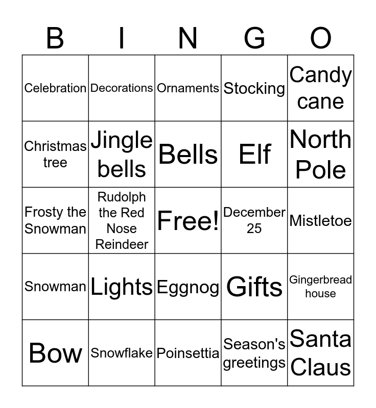 This bingo card has a free space and 25 words: Lights, Poinsettia, Bells, Bow, Candy cane, Celebration, Christmas tree, Decorations, December 25, Eggnog, Elf, Frosty the Snowman, Gifts, Gingerbread house, Jingle bells, Jolly, Mistletoe, Ornaments, North Pole, Rudolph the Red Nose Reindeer, Santa Claus, Snowflake, Snowman, Stocking and Season's greetings.