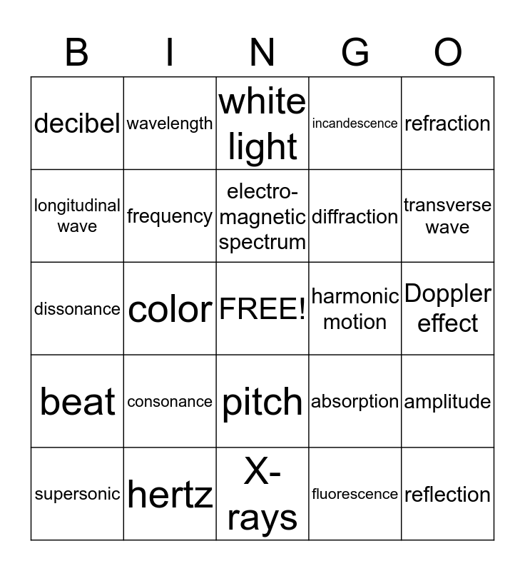 This bingo card has a free space and 24 words: consonance, hertz, electro-magnetic spectrum, supersonic, refraction, decibel, longitudinal wave, wavelength, harmonic motion, pitch, diffraction, dissonance, absorption, amplitude, frequency, fluorescence, Doppler effect, white light, transverse wave, color, reflection, beat, incandescence and X-rays.