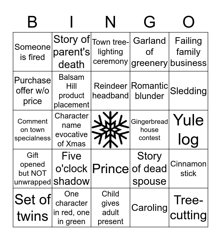 This bingo card has a free space and 76 words: The Almost Kiss, Tree-trimming, Town tree-lighting ceremony, Peripheral character of color, Word "miracle", Mittens, Children laughing, Pickup truck, Wreath on car, Job offer, Hot cocoa, Cookie contest, Reindeer headband, Purchase offer w/o price, Clear sky and snowing, Character name evocative of Xmas, Ice skating, Tree-cutting, Snowman, Failing family business, Candy canes, Comment on town specialness, Balsam Hill product placement, Story of parent's death, Garland of greenery, Church bells, Persistent boss, Decision to relocate from Big City, Reunion of childhood friends/acq., Word "blessing", Word "faith", Career-minded leading lady, Cookie- baking, Story of dead spouse, Sledding, Romantic blunder, Ugly Xmas sweater, Food eaten other than cookies, Yule log, Caroling, Egg nog, Drinking from cup that appears empty, Mistletoe, Snowball fight, Characters snowed in, Ballgown, Set of twins, Someone is fired, Someone quits job, Poinsetta being carried, Tiara, Prince, Tree w/ leaves AND snow, Secret Santa, Words "fairy tale", Words "spirit of Christmas", Turtle neck, Grumpy in-law, Fretting over party or event, Sentimental ornament, Five o'clock shadow, Someone holding a lit candle, House inconsistent w/ character's income, Snowing but no hat worn, Angel appears, Words "feels like home", Gingerbread house contest, Two-part town name, Writer character, Red flannel, Cinnamon stick, Gift opened but NOT unwrapped, One character in red, one in green, Shot of starry sky, Child gives adult present and Elf hat.