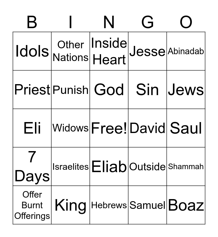 This bingo card has a free space and 24 words: Israelites, King, God, Offer Burnt Offerings, Abinadab, Idols, Priest, Other Nations, David, Eliab, Sin, Eli, Outside, Shammah, Punish, Samuel, Saul, Inside Heart, Jews, Widows, Boaz, 7 Days, Jesse and Hebrews.