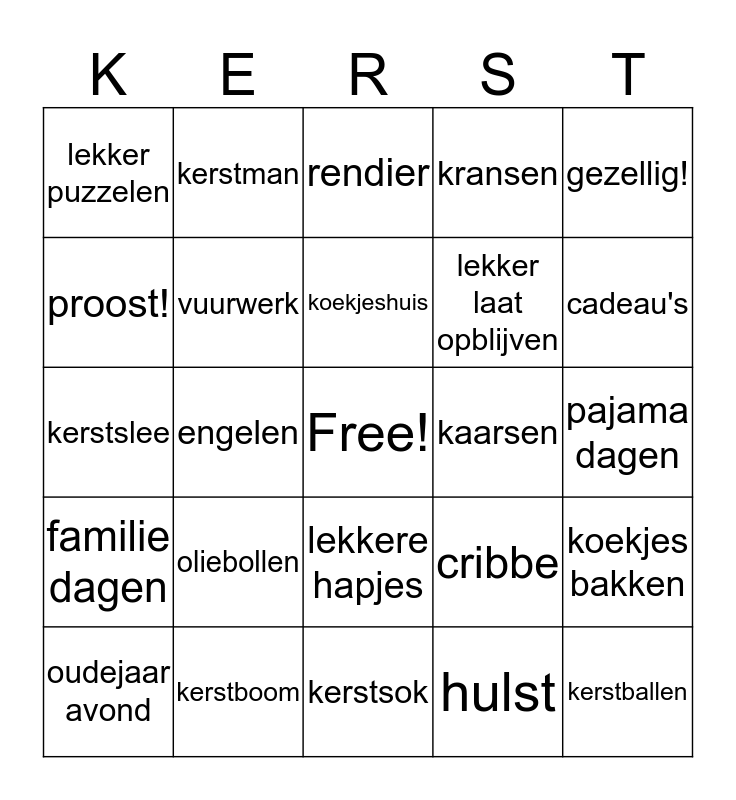 This bingo card has a free space and 29 words: oudejaar avond, herders, engelen, drie koningen, lekker puzzelen, rendier, vuurwerk, oliebollen, kaarsen, kerstboom, pajama dagen, kerstballen, kerstsok, hulst, cadeau's, schaatsen, lekkere hapjes, familie dagen, gezellig!, kerstslee, cribbe, ezel, lekker laat opblijven, proost!, kransen, kerstman, koekjes bakken, koekjeshuis and kerstmuts.