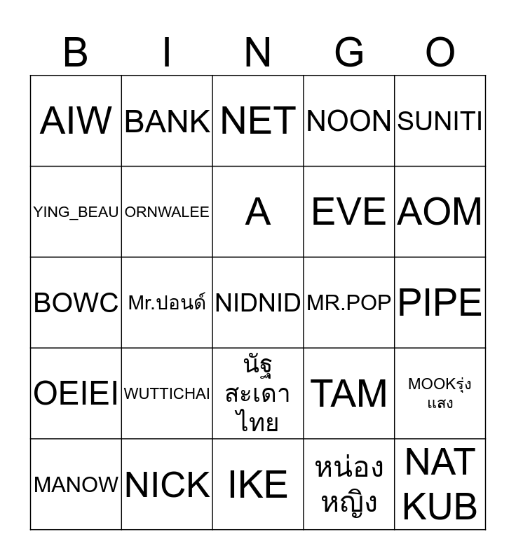 This bingo card has 65 words: Free!, MEOW, TOM, MOOKรุ่งแสง, ESS, PING, BANK, NATT, A, MING, นัฐสะเดาไทย, TUI, PIPE, SUNITI, JENJI, YING_BEAU, Mr.ปอนด์, AIW, CHOOSAK, EVE, WUTTICHAI, OEIEI, NOON, APPLE, YUNGYING, GUY, BANCHA, เชียร์, NIDNID, จ๋าPLOYNAPAS, MANOW, TING LIVERPOOL, WARAPHONG, KATCH, TAM, NICK, JALIP, BOWC, หน่องหญิง, RUNG, ORNWALEE, TON SMOOTH, MR.POP, WI, AEMYLIN, DAY, AOM, กฤต, NAT KUB, NUT, RONG, KOOK, MOOK, IKE, BALLOON, SUTASINEE, AIR, NET, GREAT, WARNWHAN, AOF, MY, ZIAN, PANG and OHM.