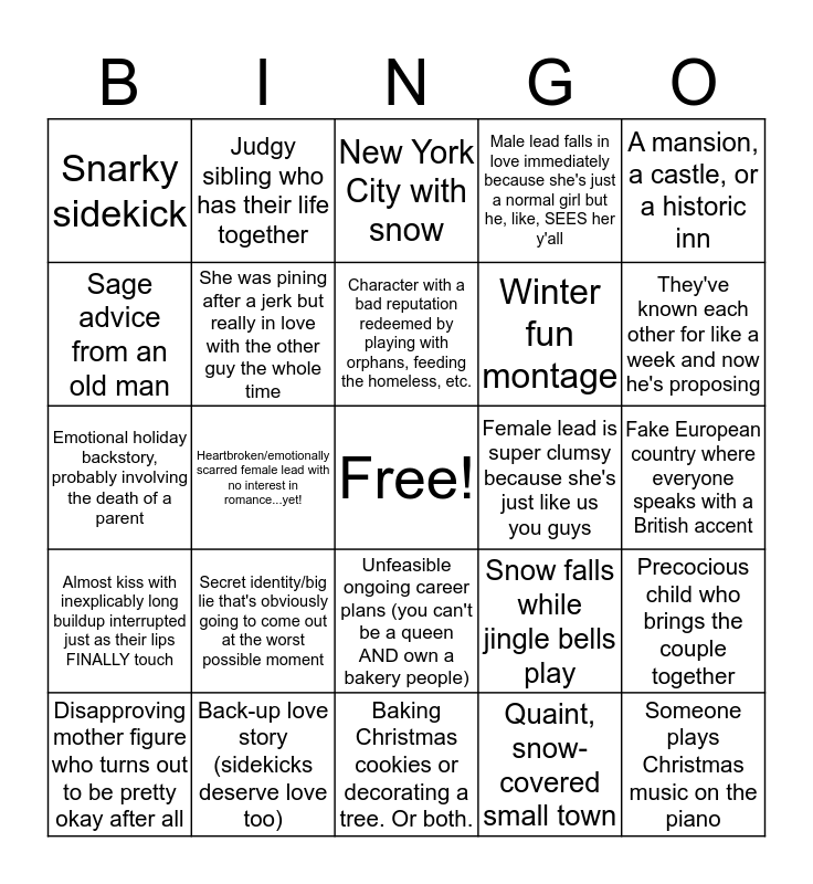 This bingo card has a free space and 26 words: Unfeasible ongoing career plans (you can't be a queen AND own a bakery people), Quaint, snow-covered small town, Character with a bad reputation redeemed by playing with orphans, feeding the homeless, etc., Back-up love story (sidekicks deserve love too), A mansion, a castle, or a historic inn, Snarky sidekick, Sage advice from an old man, Judgy sibling who has their life together, Fake European country where everyone speaks with a British accent, Snow falls while jingle bells play, Winter fun montage, Emotional holiday backstory, probably involving the death of a parent, Precocious child who brings the couple together, Disapproving mother figure who turns out to be pretty okay after all, Heartbroken/emotionally scarred female lead with no interest in romance...yet!, Like totally demanding boss asking someone to actually do their job, Male lead falls in love immediately because she's just a normal girl but he, like, SEES her y'all, Almost kiss with inexplicably long buildup interrupted just as their lips FINALLY touch, New York City with snow, Someone plays Christmas music on the piano, They've known each other for like a week and now he's proposing, Baking Christmas cookies or decorating a tree. Or both., Female lead is super clumsy because she's just like us you guys, Secret identity/big lie that's obviously going to come out at the worst possible moment, She was pining after a jerk but really in love with the other guy the whole time and She's like super talented, but no one believes in her (except the love interest).