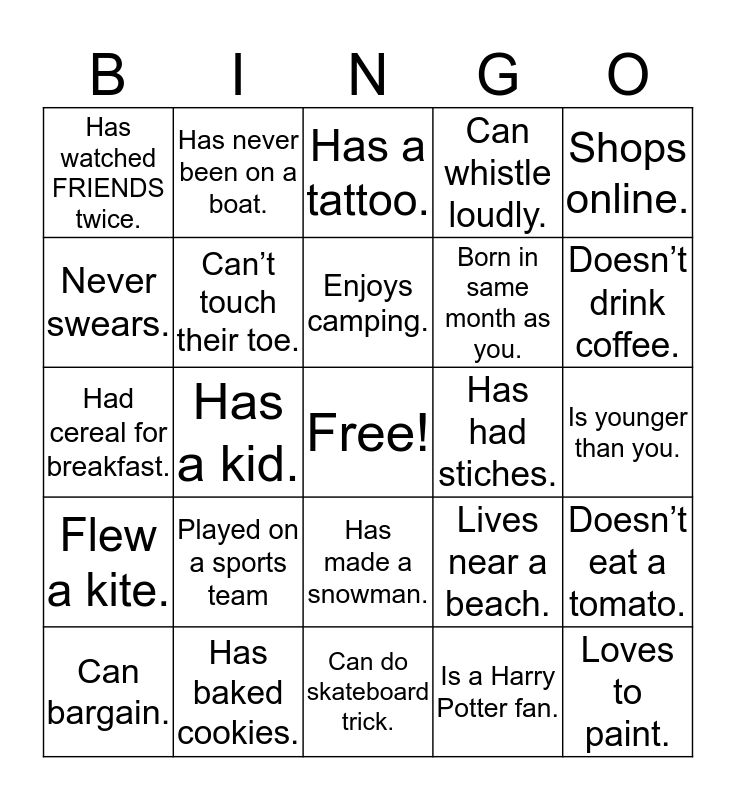 This bingo card has a free space and 25 words: Played on a sports team, Can do skateboard trick., Enjoys camping., Can bargain., Shops online., Has watched FRIENDS twice., Never swears., Has never been on a boat., Has had stiches., Has made a snowman., Born in same month as you., Had cereal for breakfast., Lives near a beach., Doesn’t eat a tomato., Can’t touch their toe., Is vegan., Is younger than you., Has a tattoo., Doesn’t drink coffee., Has a kid., Loves to paint., Has baked cookies., Flew a kite., Can whistle loudly. and Is a Harry Potter fan..