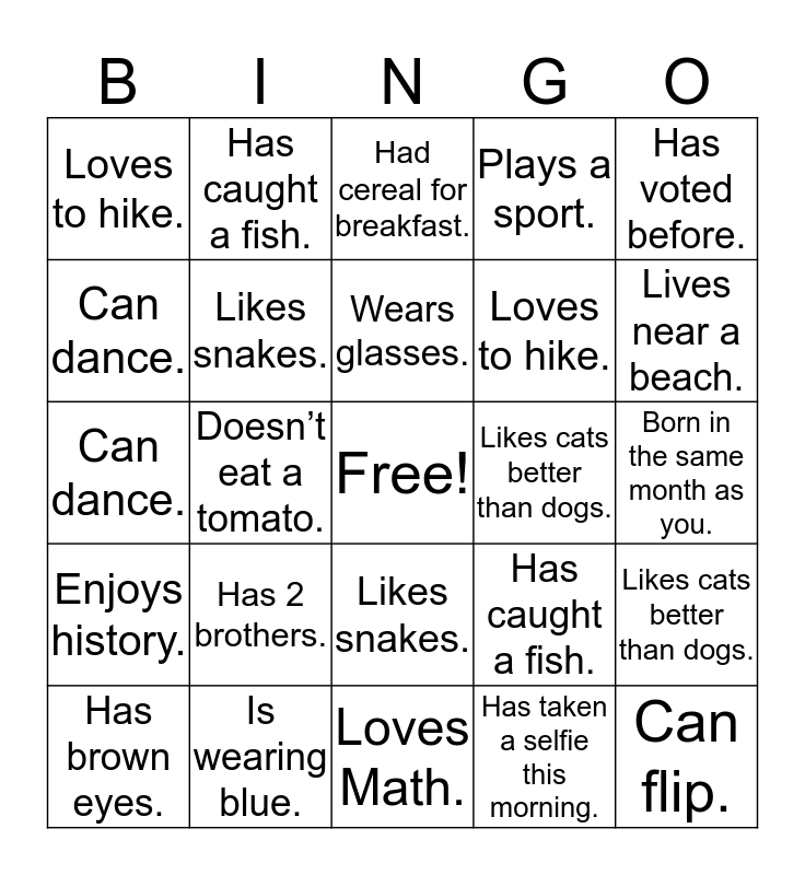 This bingo card has a free space and 25 words: Has 2 brothers., Loves Math., Wears glasses., Has brown eyes., Has voted before., Loves to hike., Can dance., Has caught a fish., Likes cats better than dogs., Likes snakes., Loves to hike., Can dance., Has caught a fish., Likes cats better than dogs., Likes snakes., Has made a snowman., Born in the same month as you., Had cereal for breakfast., Lives near a beach., Doesn’t eat a tomato., Can flip., Is wearing blue., Enjoys history., Plays a sport. and Has taken a selfie this morning..