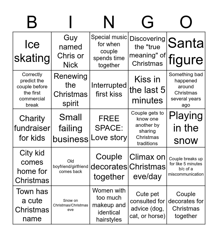 This bingo card has a free space and 33 words: Planning a Christmas event, Picking a Christmas tree, Small failing business, Christmas hasn't been the same since _____ died., City kid comes home for Christmas, Renewing the Christmas spirit, Santa figure, Town has a cute Christmas name, Guy named Chris or Nick, Girl named Laurel, Holly, or Noel, Interrupted first kiss, Special music for when couple spends time together, "Bad guy" has a change of heart, Christmas miracle/ magic, Couple gets to know one another by sharing Christmas traditions, Something bad happened around Christmas several years ago, Snow on Christmas/Christmas eve, Charity fundraiser for kids, Old boyfriend/girlfriend comes back, Climax on Christmas eve/day, Couple decorates together, Cute child brings people together, Ice skating, Playing in the snow, Women with too much makeup and identical hairstyles, Couple decorates for Christmas together, Discovering the "true meaning" of Christmas, Kiss in the last 5 minutes, Correctly predict the couple before the first commercial break, Couple breaks up for like 5 minutes b/c of a miscommunication, Special Christmas ornament, Cute pet consulted for advice (dog, cat, or horse) and City kid decides to quit job and stay in small town.