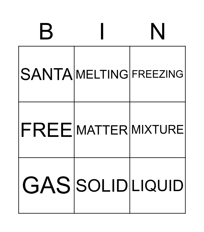 This bingo card has a free space and 11 words: ELEMENT, SOLID, LIQUID, GAS, MELTING, FREEZING, MIXTURE, SOLUTION, FREE, SANTA and SNOW MAN.