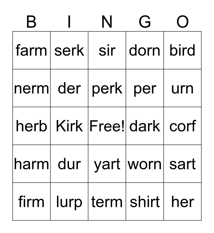 This bingo card has a free space and 35 words: skirt, der, skirt, der, yart, dorn, nerm, car, perk, wurb, herb, bird, yar, dorb, farm, dark, shirt, Kirk, harm, her, worn, firm, sart, lurp, sir, urn, merd, tart, per, corf, birl, term, dur, serk and dart.