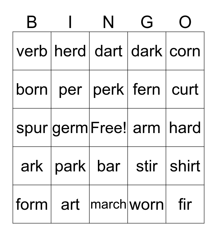 This bingo card has a free space and 89 words: skirt, lark, march, mark, turf, term, perk, far, herb, bird, car, turn, dark, shirt, farm, park, fork, worn, firm, Kirk, harm, her, fern, urn, spur, perm, sir, tar, term, tart, per, perk, par, corn, surf, herd, dart, card, hard, pork, lurk, curl, sort, church, form, fort, cart, stir, torn, verb, curb, burp, cord, girl, barn, morn, lord, arm, irk, burn, horn, harp, bark, jar, fur, hurl, blur, carp, fir, ark, art, bar, dorm, curt, born, cork, nor, port, hurt, dirt, germ, mar, nurse, purse, chart, stern, flirt, squirt and thorn.