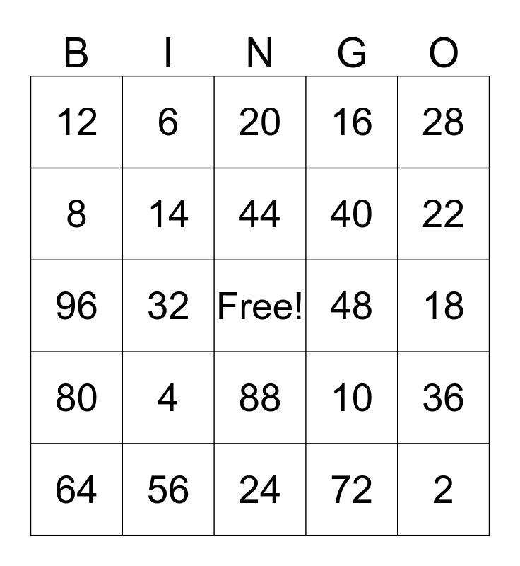 This bingo card has a free space and 24 words: 4, 56, 44, 64, 28, 12, 8, 6, 48, 88, 40, 96, 10, 36, 14, 72, 18, 20, 22, 32, 2, 80, 16 and 24.