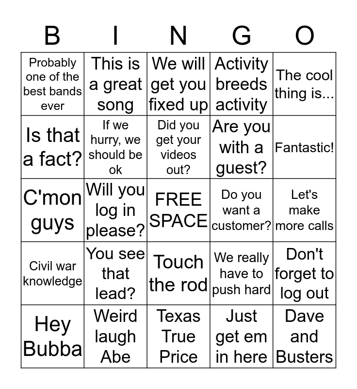 This bingo card has a free space and 24 words: Hey Bubba, You see that lead?, Did you get your videos out?, Just get em in here, The cool thing is..., Probably one of the best bands ever, This is a great song, We will get you fixed up, Do you want a customer?, Let's make more calls, C'mon guys, If we hurry, we should be ok, We really have to push hard, Don't forget to log out, Is that a fact?, Weird laugh Abe, Texas True Price, Activity breeds activity, Fantastic!, Civil war knowledge, Will you log in please?, Touch the rod, Are you with a guest? and Dave and Busters.